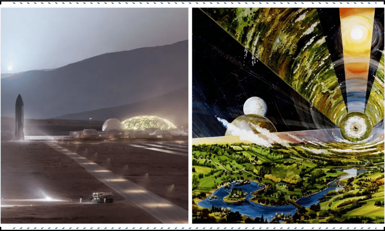 Artist's impressions of Musk's Mars city (left) and an O'Neill cylinder (right).