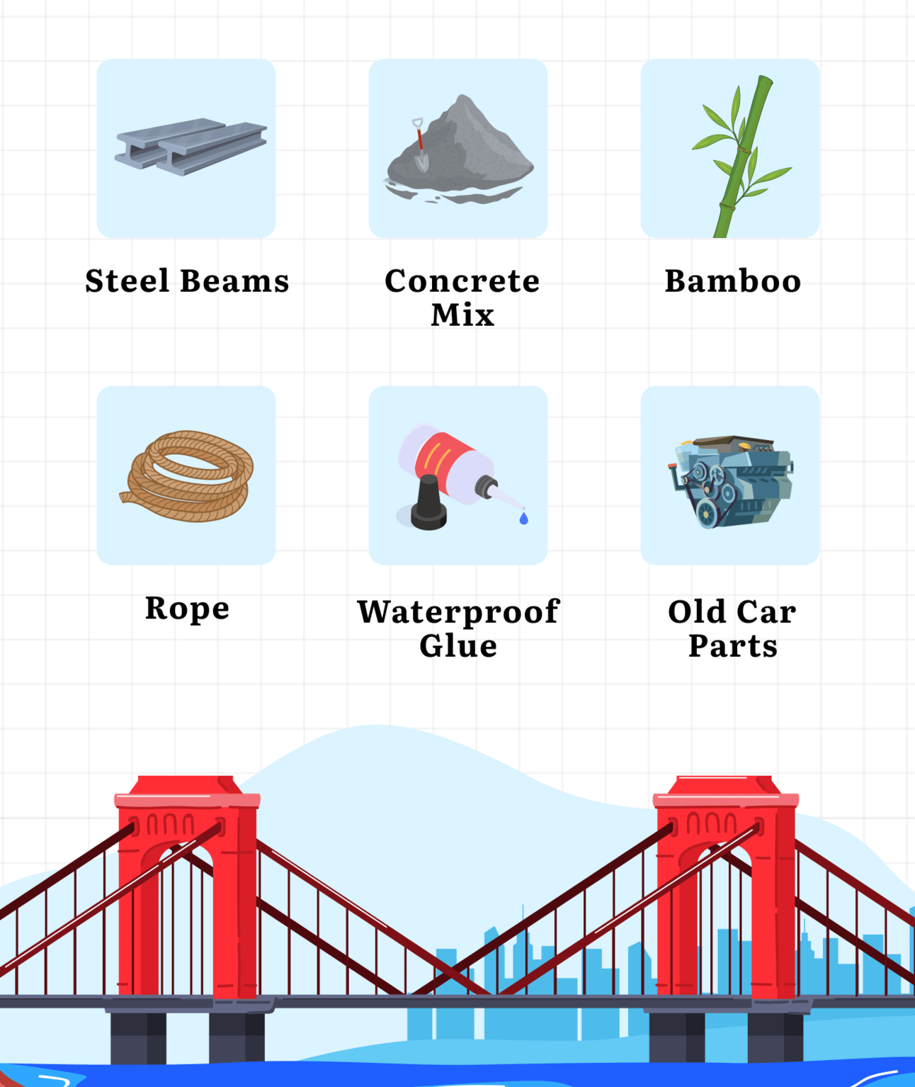 Your task: You're stuck on an island. You need to build a bridge to escape, but you only get 3 out of the following 6 materials. Which do you choose?
