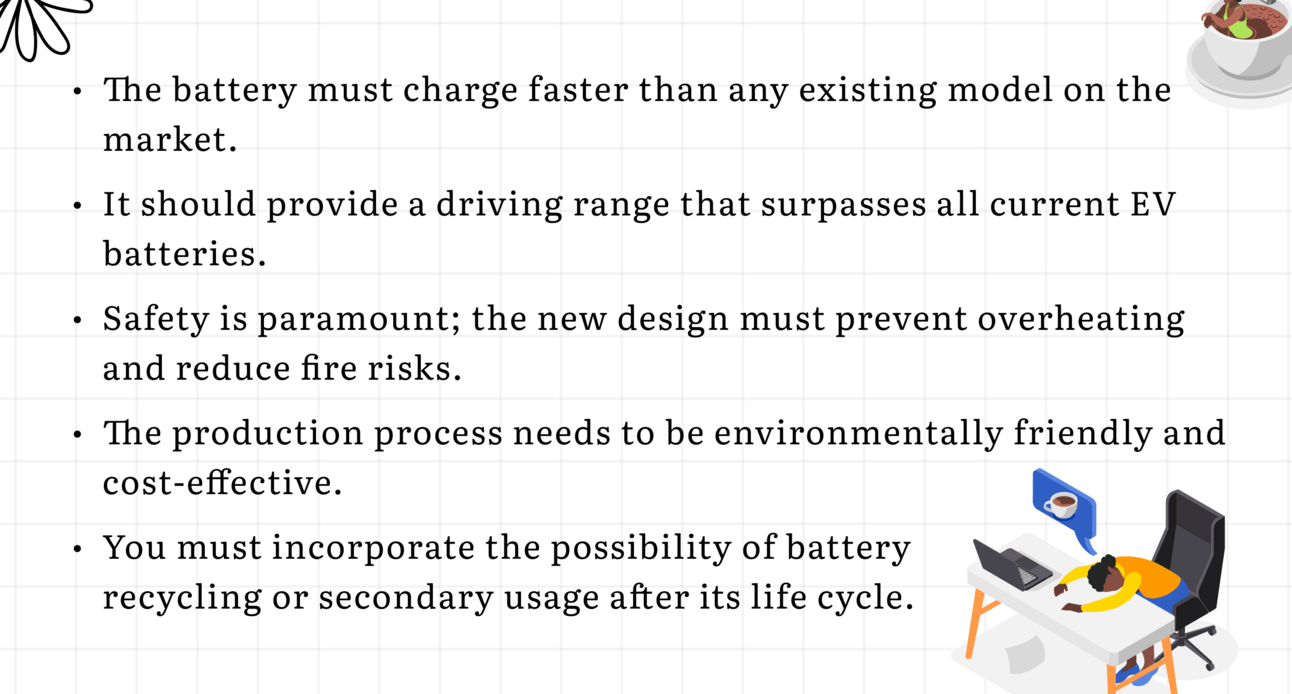 Imagine you're a lead engineer at an innovative tech firm, and you've been given the green light to develop a groundbreaking electric vehicle (EV) battery. The stakes are high, and the company is aiming to leapfrog the competition with this new product.